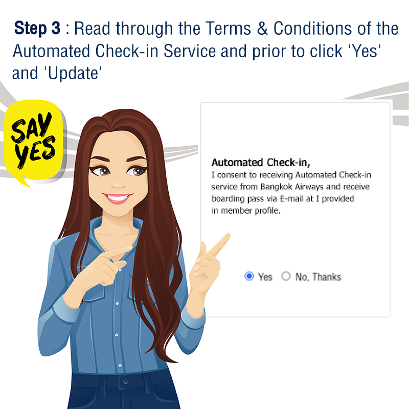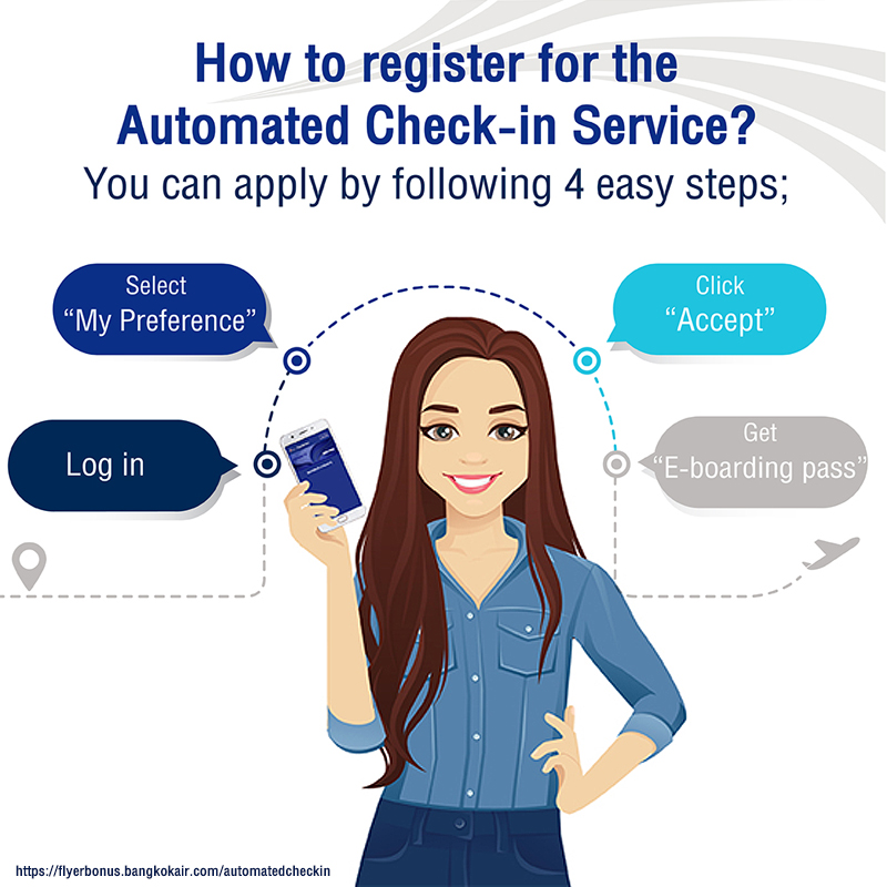 FlyerBonus members can enable or disable utilisation of the FlyerBonus Automated Check-in Service by updating their preferences via 'My Profile'> 'My Preference' menu at flyerbonus.bangkokair.com at least 12 hours prior to any flight booked.