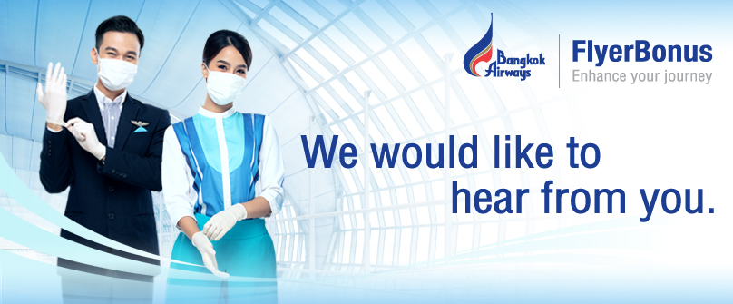 Bangkok Airways would like to thank you for your continued trust and support during these difficult times. As health and safety is always our top priority, it is necessary for the airline to adjust or suspend certain services and set up precautionary measures during COVID-19 pandemic in compliance with the guidelines laid out by the Ministry of Public Health and the Civil Aviation of Thailand. However, Bangkok Airways aims to provide highest level of comfort and satisfaction in our passenger services even with certain limitations under these circumstances. To make sure we are working our way to meet your expectations, we kindly invite you to complete customer satisfaction survey on your travel experience with Bangkok Airways. Passenger may provide feedback on our response to the current situation in a comment box at the end of the survey. Your comments and feedbacks are crucial to product and service development for the airline.