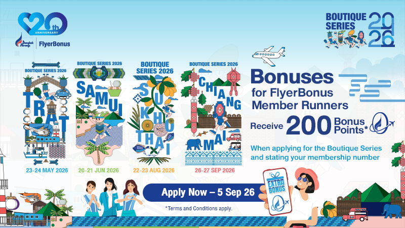 Join the Bangkok Airways Boutique Series 2026 and celebrate 20 years of FlyerBonus while doing what you love. Members will receive 200 BONUS points* when registering for any race in the series. Simply submit your registration details and remember to quote your 8-digit FlyerBonus membership number at the bottom of the registration page.